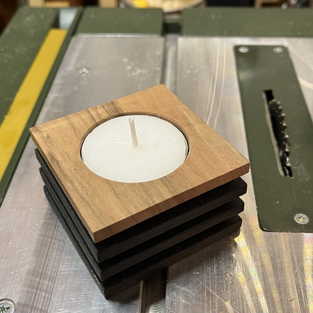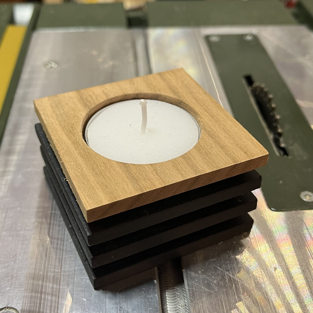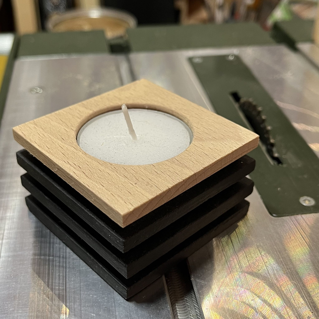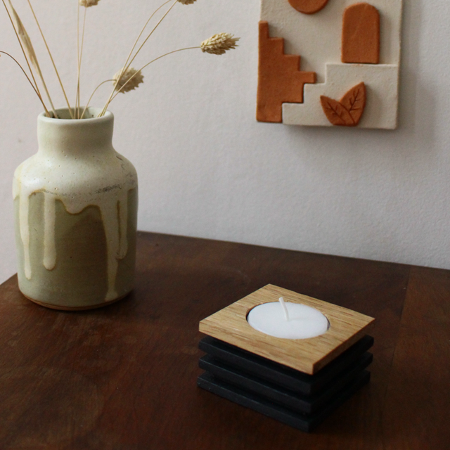 Vous avez le choix entre plusieurs bois pour le dessus : chêne, hêtre, noyer ou cerisier. Chaque bougeoir est vendu avec un bougie chauffe-plat de 8 heures.